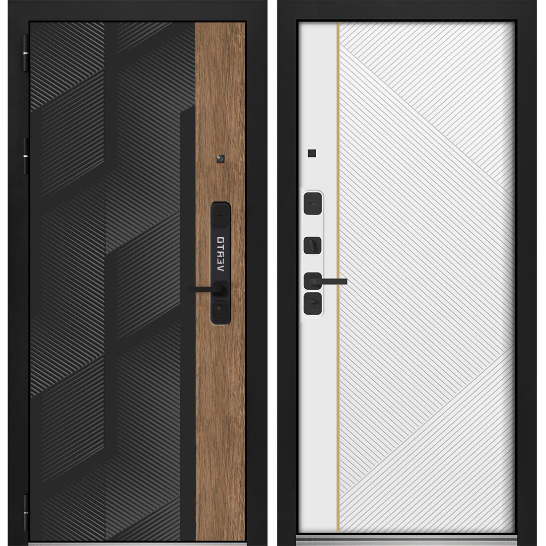 Фурнитура: Черного цвета Ручка на квадратной планке раздельная стяжная; независимая ночная задвижка, глазок. Порог из нержавеющей стали.